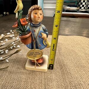 Congratulations" Hummel figurine, #17/0, that was the final issue in 1999. This figurine depicts a girl holding a potted flower, a bird, and a horn.