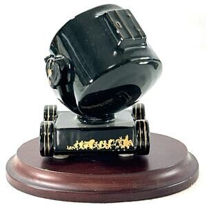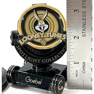 Vintage 1997 Goebel Looney Tunes Spotlight Collection figurine featuring the iconic Bugs Bunny spotlight logo. Finished in glossy black with gold detailing, this collectible comes attached to a polished wood display base.