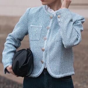 Goelia Tweed Round Neck Jacket in Blue White Jacquard. Size M / Medium. Features round neckline, slightly fitted silhouette, long sleeves with button cuffs, front patch pockets, front button down closure, gold hardware, tweed fabrication. 48% cotton, 26% polyester, 17% acrylic, 8% wool, 1% other fibre. Brand new, never worn, nwt, new with tags.