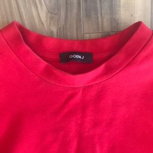 Goen.J Red Ruffle Trim Tunic. In like new condition and shows no signs of wear. Has only been worn twice! Size small / US 4. Runs small. Approx. 32” in length. 100% Cotton. Pulls on over head. Hand wash in cold water. Made in Korea.