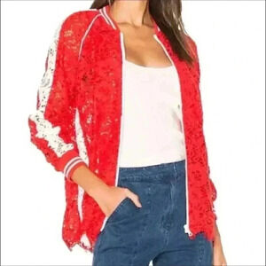 Goen.J ruby red white lace bomber jacket in size 4. Has super cute zipper details on the side.