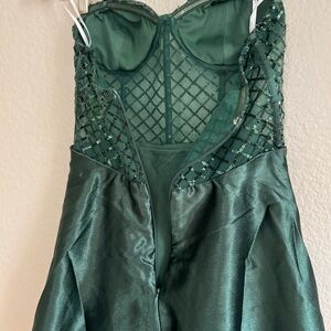 Lulus Going Glam Dark Green Sequin Bustier Skater Dress never skimps when it comes to the sparkle! Sheer mesh, decorated with rows of gorgeous sequins, shapes a bustier-style bodice with padded cups and corset-inspired boning, all supported by detachable, adjustable spaghetti straps. High waist tops the sleek satin skater skirt. Hidden back zipper/clasp.