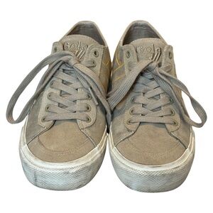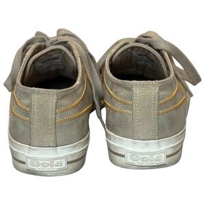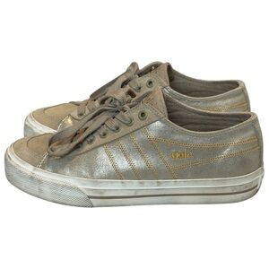These Gola CLA409 Quota II Shimmer Sneakers in Metallic Gold are a Women’s 6. Super cute and a rare colorway. The insoles and outsoles are in good condition; there’s some moderate discoloration at the midsoles and a small aberration at the top of the left shoe. Priced accordingly!
