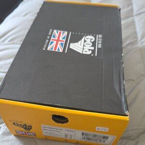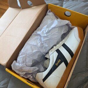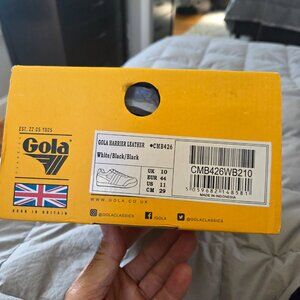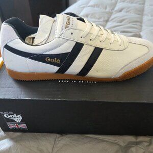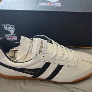 Genuine Gola Harrier white leather sneaker with black stripes and gum sole is brand new, in-the-box, never used. Mens size 11 US and 44 EU.