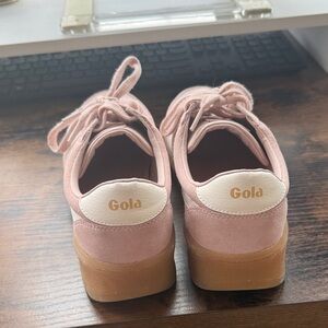 Stylish pink suede sneakers with white accents. Comfortable and trendy for everyday wear.