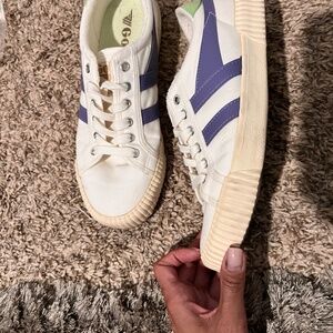 Barley used, will be cleaning before sending off. Only wore a few times. Size 9. I just don’t wear them much to keep them. They are like a cream white with periwinkle stripes.