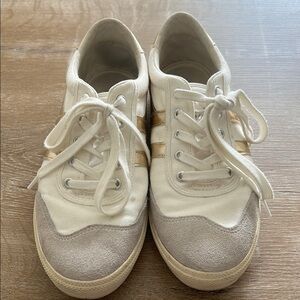 Experience timeless style with Gola's white and gold sneakers, featuring a minimalist design and a comfortable low-top fit. Crafted from premium materials, these sneakers blend leather and suede for a sophisticated look. The rubber soles ensure durability and traction, making them perfect for everyday wear. Minor wear as seen in photos. Some spot stains seen in photos.