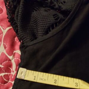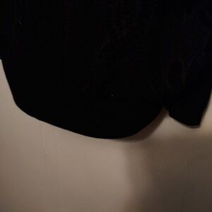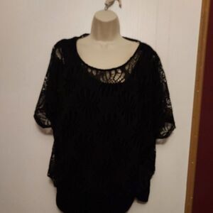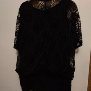 Black short sleeve laced blouse with interior blouse so,lid panel at bottom