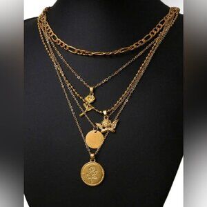 This stunning gold layered necklace set adds a touch of elegance to any outfit. Perfect for any occasion, it features intricate designs that stand out beautifully. Elevate your style with this exquisite piece.