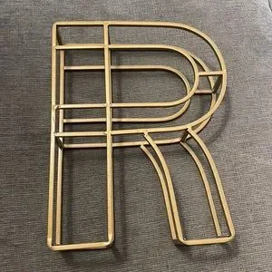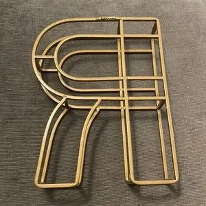 Gold colored metal R in 3D. Wall hanger on back.