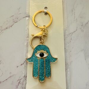 Elegant gold and turquoise Hamsa keychain/bag chsrm with sparkling details.