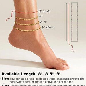 ANKLES SIZE - Gold ankle bracelets are available in 3 sizes of 6 inches, 6.8 inches and 7.2 inches for your choice. Each ankle comes with a 1-inch adjustable extension chain to accommodate various ankle sizes and personalized preferences. Each to put on and take off. Guaranteed maximum comfort. Show your ankle sexy without feeling cumbersome.