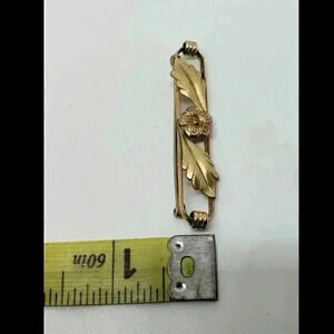 Vintage Antique Art Nouveau Period Brooch Flower 12 KT Gold Filled Bar Pin. It is rectangular shaped with an almost art deco ribbed band on each side and a repousse flower in the center accented by a leaf on either side. Stamped 120/12 kt.