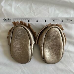 Adorable gold baby moccasins perfect for your little one's first steps. Soft and comfortable design for everyday wear. Never worn!
