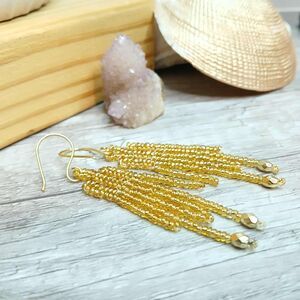 Gold Beaded Dangle Fringe Earrings, Seed Bead Jewelry, Boho Chic, 3"