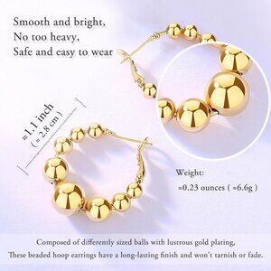 Features: These chunky hoop earrings are about 1.1 inches in diameter, lightweight at just 0.23 oz, and made from high-quality 18k gold-plated copper. They showcase a fun, unique design with differently sized lustrous beads that add texture and shine. The screw back closure makes them secure and easy to wear all day or night.