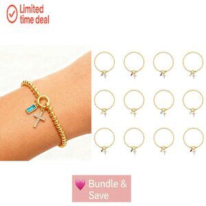 Gold Beaded Stretch Bracelet with Cross Charm & Birthstone, 9.45"