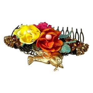 This handcrafted hair comb features bold autumn roses in rich yellow, orange, and red hues with jeweled accents and a gold bird motif. Designed with vintage jewelry components for a one-of-a-kind bohemian statement piece—perfect for weddings, festivals, or special occasions. NWT and packaged for gifting.