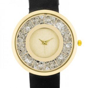 Goldtone Black Leather Fashion Watch With Clear Crystal Accents. Clear crystals radiant metal tones and leather straps accent the face of a contemporary watch. Our watch selection is stylishly designed without sacrificing comfort. We offer different color and style variations. Browse our selection and you'll definitely find your unique look.