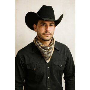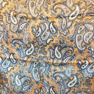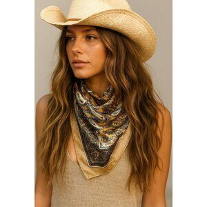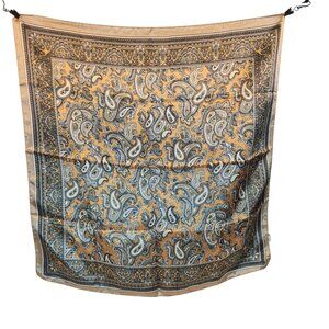 This luxurious square scarf features a striking gold, beige and black paisley design, perfect for adding an elegant, retro touch to any outfit. The lightweight silk fabric offers versatility and comfort, ideal for wearing as a stylish neck scarf, head wrap, or fashion accessory. With its boho-chic and western-inspired pattern, this scarf complements a variety of looks, from casual wear to formal ensembles. Measuring 23 inches square, it is generously sized for creative styling options, making it a must-have addition to any wardrobe.