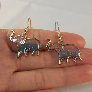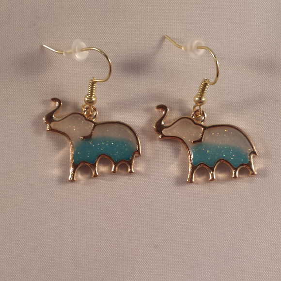 Beautiful new women's chic classic elephant design gold frame elephant animal shaped mystical teal blue turquoise slightly glittery acrylic dangle hook earrings. Handmade, hypoallergenic hooks, brand new never been worn. Lead and nickel free. Rubber backs included. These earrings sparkle.
