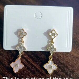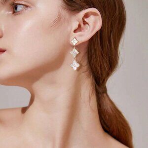 Gold Boho Womens Long Leaf & Flower Earrings Embedded With Rhinestones