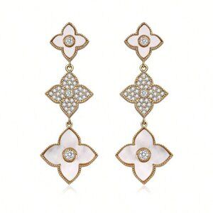 Gold Boho Womens Long Leaf & Flower Earrings Embedded With Rhinestones