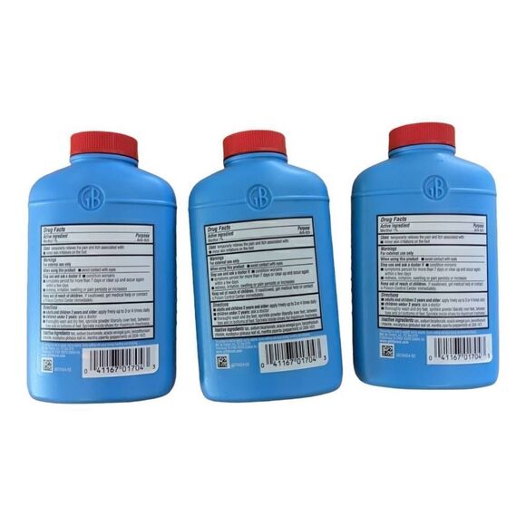 Three brand new bottles of Gold Bond Medicated Foot Powder Maximum Strength with TALC. Each bottle is 4 oz and contains 1% of menthol. This product is no longer made with Talc. Comes from a smoke-free and pet-free home.