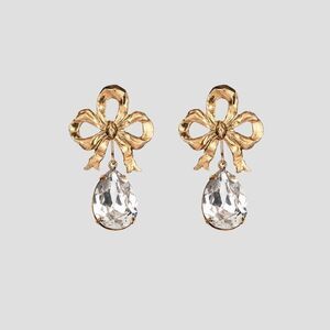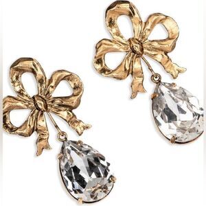 Elegant gold bow earrings featuring a stunning crystal drop. Perfect for adding a touch of sophistication to any outfit.