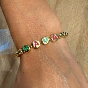 Stylish gold bracelet featuring the word Mama in pink letters. Size petite 5.5