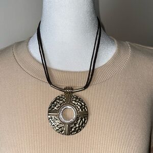 Gold Brass Tone Statement Pebbled Artsy Pendant & Triple Strand Jute Necklace