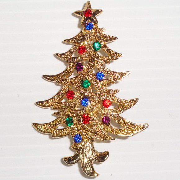 Gold CHRISTMAS TREE PIN with Red & Green CRYSTALS Boxed