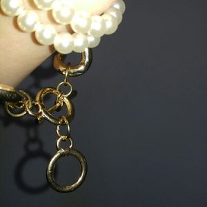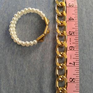 Beautiful 2 piece Bracelet Set. One is elastic pearl band with gold. One is a gold link chain that can be worn at 10" or 9". Both compliment each other but could be worn separately too.
