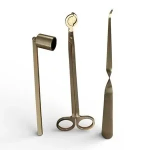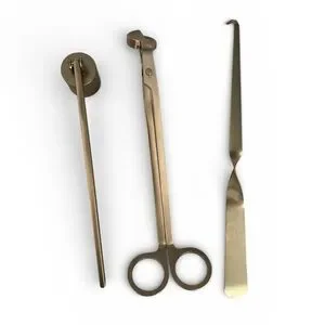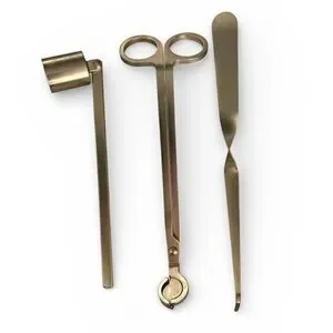 Elegant gold candle accessory set. Includes snuffer, wick trimmer, and dipper.