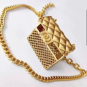 Make a bold and stylish statement with this unique gold chain body harness, featuring a miniature quilted bag as the centerpiece. Perfect for elevating your outfit with an edgy and luxurious touch, this accessory combines fashion with function.