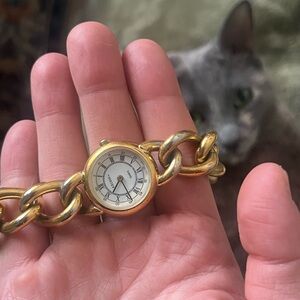 It has a hinge snap clasp. Good condition! Some scratches on face crystal. Needs a new battery. Made by Axcess. Measures 7.87 inches.