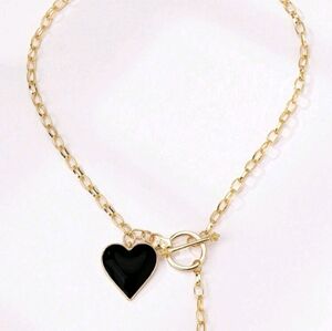 Enhance your style with this stunning gold chain necklace featuring a black heart pendant. Designed for elegance and versatility, this piece is perfect for both casual and formal outfits. The necklace includes a toggle clasp and an additional black charm, adding a unique touch to its design. Ideal as a gift for special occasions or a chic addition to your jewelry collection.