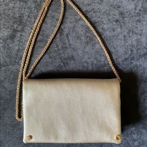 This is a very cute light gold shoulder bag with a gold chain. Although it’s small it has a lot of space. The chain can also be removed to carry it as a clutch!