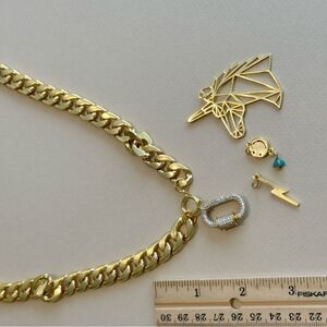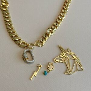 Stylish gold chain necklace featuring unique charms. Includes a unicorn, lightning bolt, and turquoise accent.