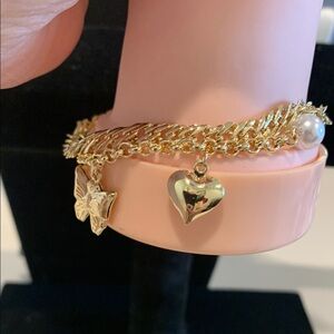 Elegant gold plated charm bracelet featuring a butterfly and heart design. Perfect for adding a touch of sophistication to any outfit.