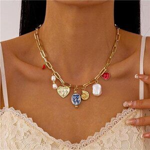 Add a playful touch to your summer style with this trendy charm necklace featuring a mix of heart, pearl, pepper, and ceramic conch pendants. Adjustable and lightweight, it’s the perfect piece for layering or wearing solo.