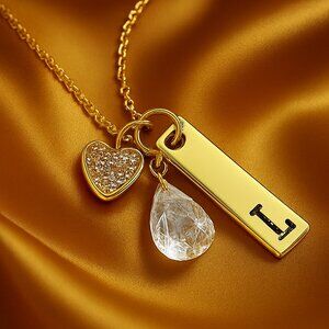 This gold-tone charm necklace features a sparkling crystal heart, an engraved “L” initial tag, and a teardrop quartz pendant for a touch of elegance. A versatile accessory perfect for layering or wearing on its own. Makes a meaningful gift for someone special or a chic addition to your own jewelry collection.