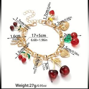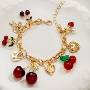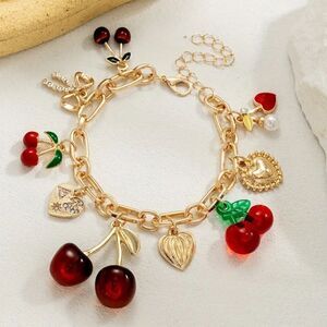 Elegant gold bracelet featuring charming cherry and heart pendants. Perfect for adding a playful touch to any outfit.