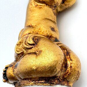 This set of two gold cherub figurines showcases exquisite craftsmanship. One cherub plays a flute, while the other sits gracefully on a rock. Made of durable resin, these decorative pieces add a timeless charm to any space. Height approximately 4 inches.