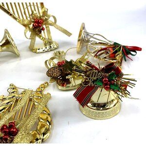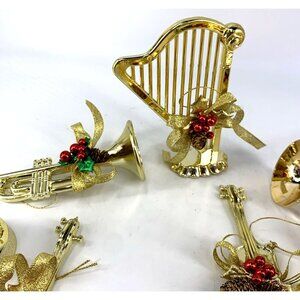 Gold Christmas Ornaments Musical Instruments Plastic 6" Lot of 8 Vintage
