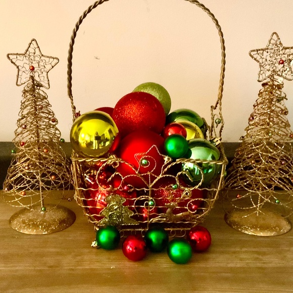 Wire basket full of red and green Christmas bulbs is about 12” tall and 7” wide. Matching Christmas trees are 10” tall. The basket and trees are made out of gold wire snd have beads and tiny bulbs woven into them. Very pretty! You will receive everything shown in the pictures.