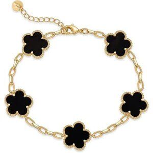 HIGHLIGHTS: This gold flower bracelet for women features an adjustable 7" + 1" paperclip chain, ensuring it fits perfectly on any wrist. Each black onyx clover charm measures 13mm and features carefully selected gemstones that catch the light beautifully, making this bracelet a standout addition to your gold clover jewelry collection that's designed to be worn and loved daily.