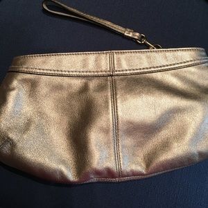 Used twice. This gold clutch is perfect for any special occasion and fits all the essentials. A wrist strap is detachable for two different looks. The clutch encloses with a zipper and there is also one interior zip-up pocket.