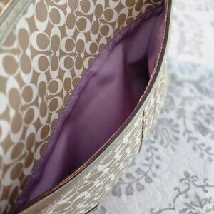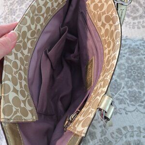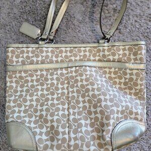Coach gold tote with lots of space! Two large outside pockets, zipper pocket inside and 2 cell phone pouches. Small ink stain on inside pocket.