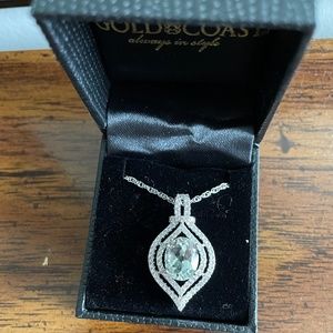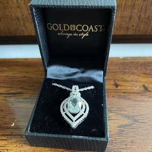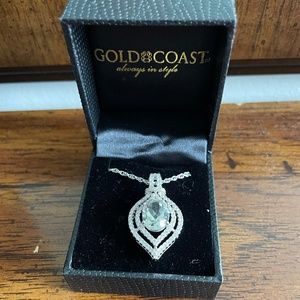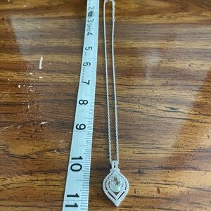 The center gem is large, surrounded by gems in a pattern that is elegant and beautiful. The gems appear to be "fake" diamonds as shown in the pictures. The necklace is adjustable in length depending on the person and the outfit!
